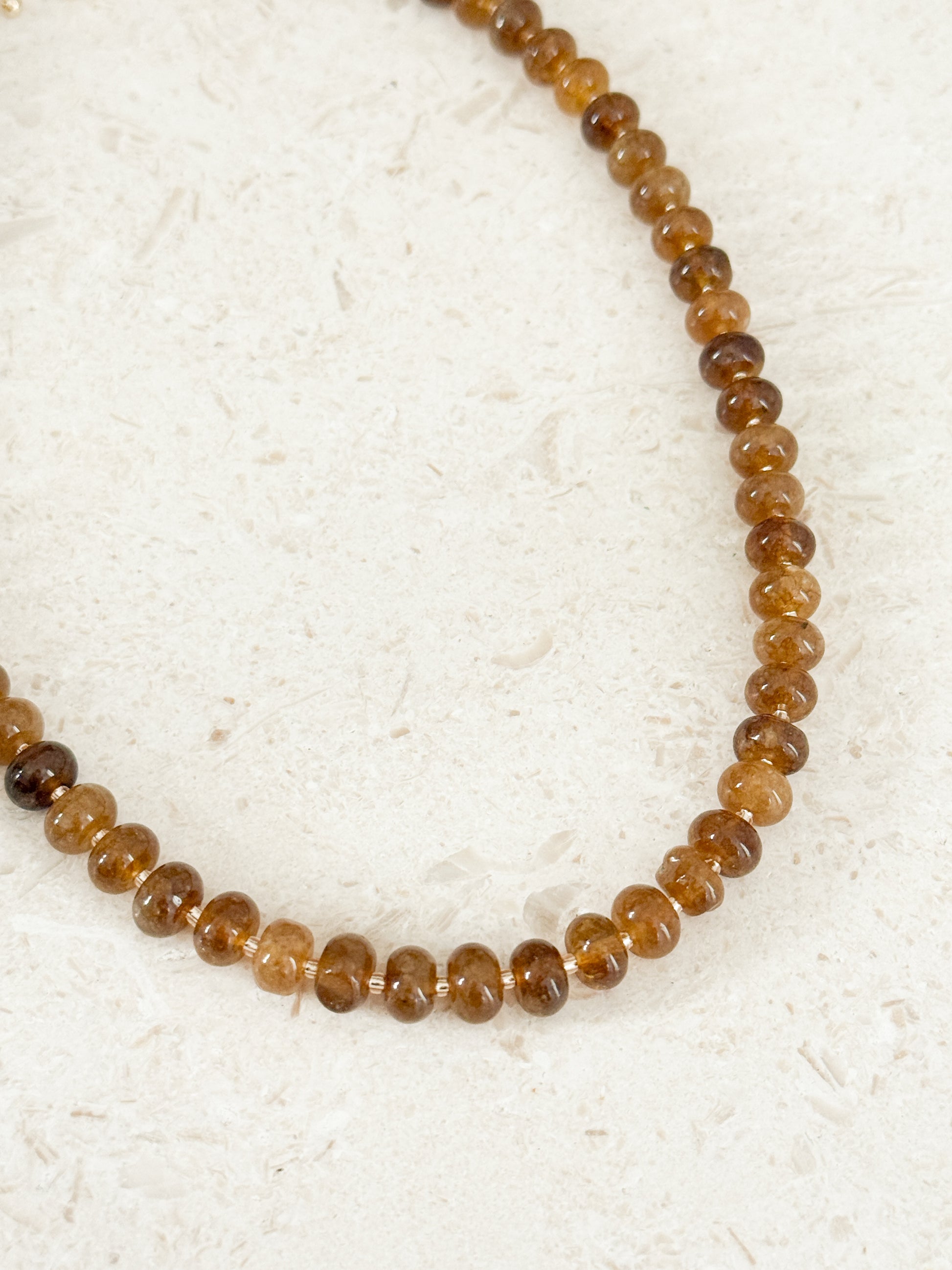 This warm brown agate gemstone necklace features rich, earthy tones with natural depth and variation. Each stone uniquely formed by nature. Brown agate is known as a stone of stability, grounding, and emotional balance, believed to promote inner strength, protection, and a calm, steady energy. Finished with subtle gold accents, this necklace is lightweight, timeless, and designed for everyday wear or effortless layering.