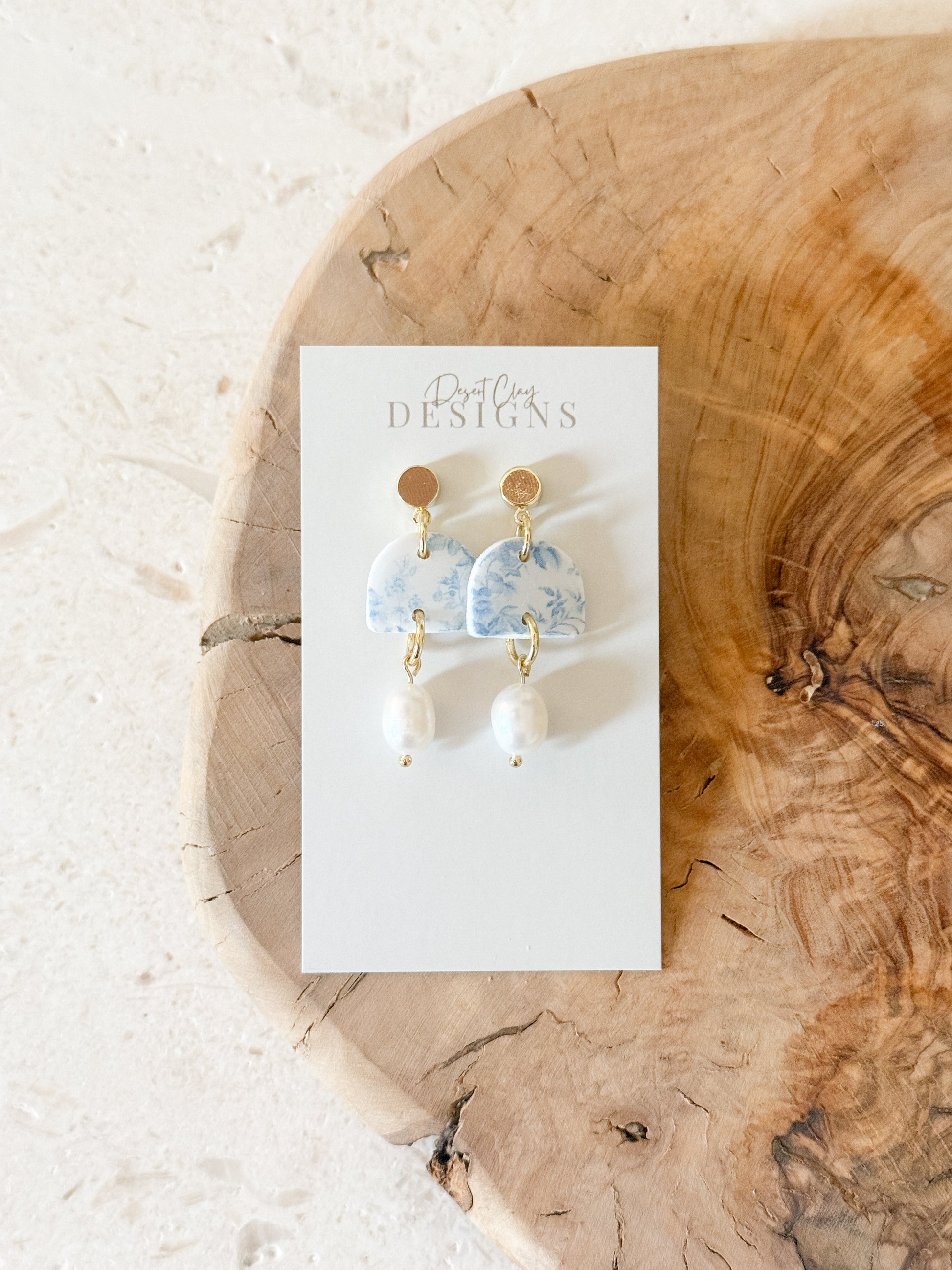 Delicate blue-and-white patterned clay drops paired with freshwater pearls. Lightweight and full of charm, these earrings add a soft statement that feels equal parts playful and timeless.