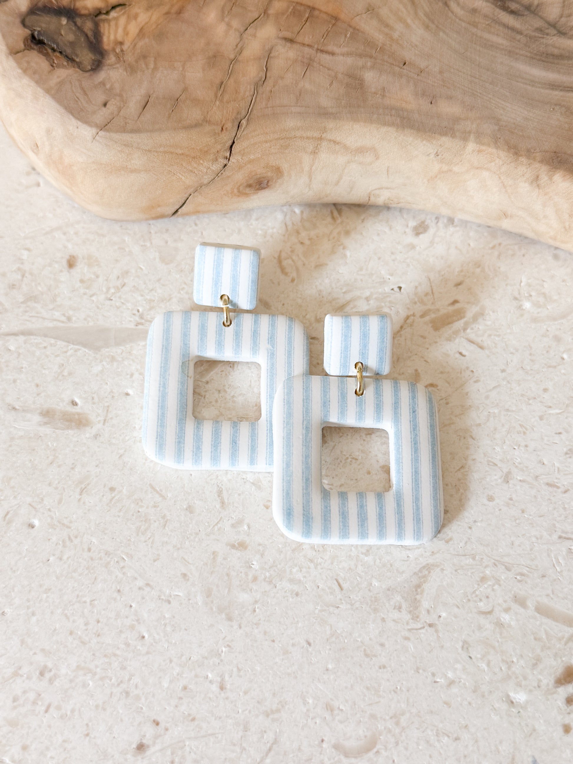 Geometric clay dangles featuring a soft blue stripe pattern and open square design. Lightweight with subtle movement, these earrings add a modern statement with an airy feel.