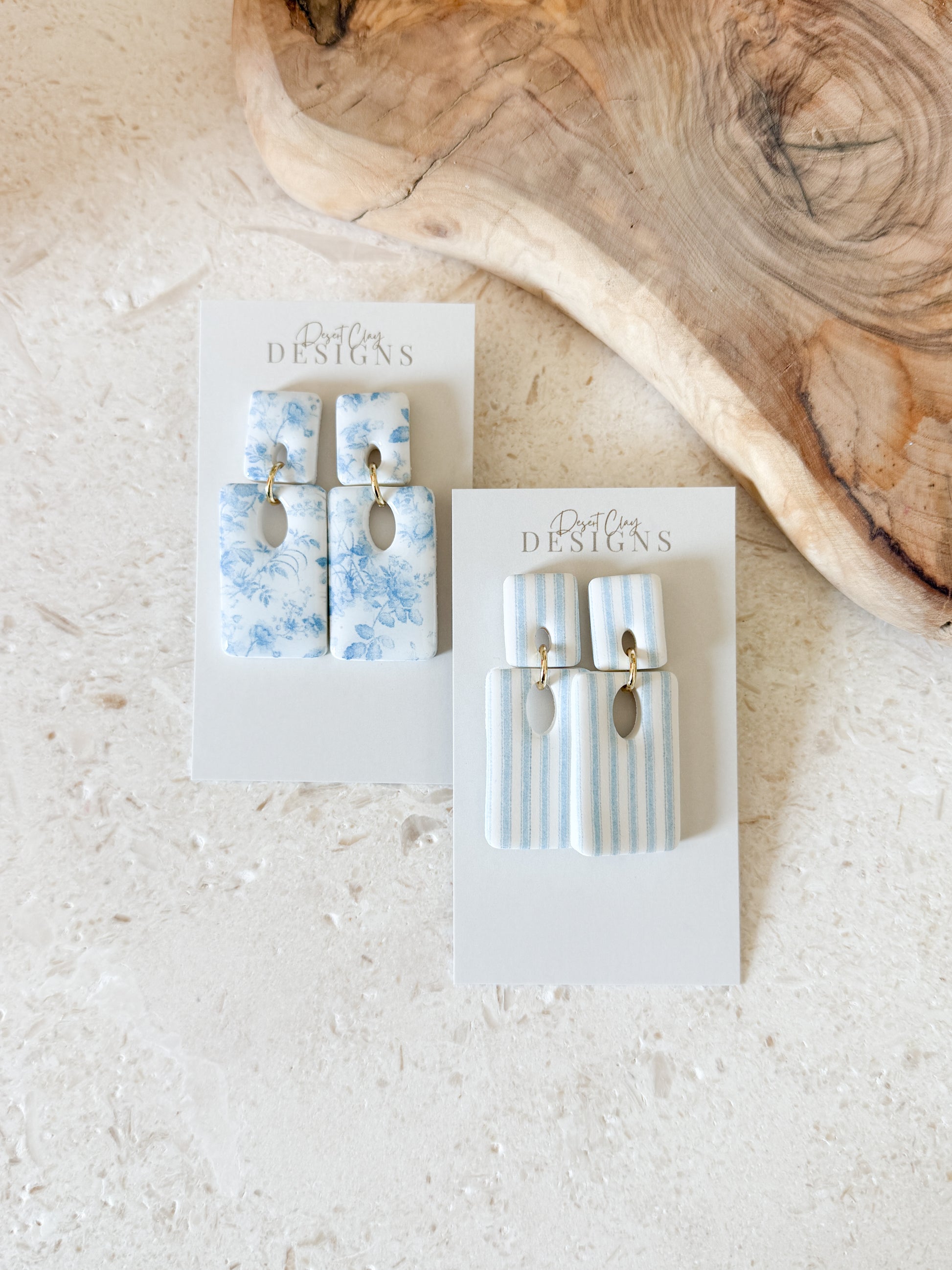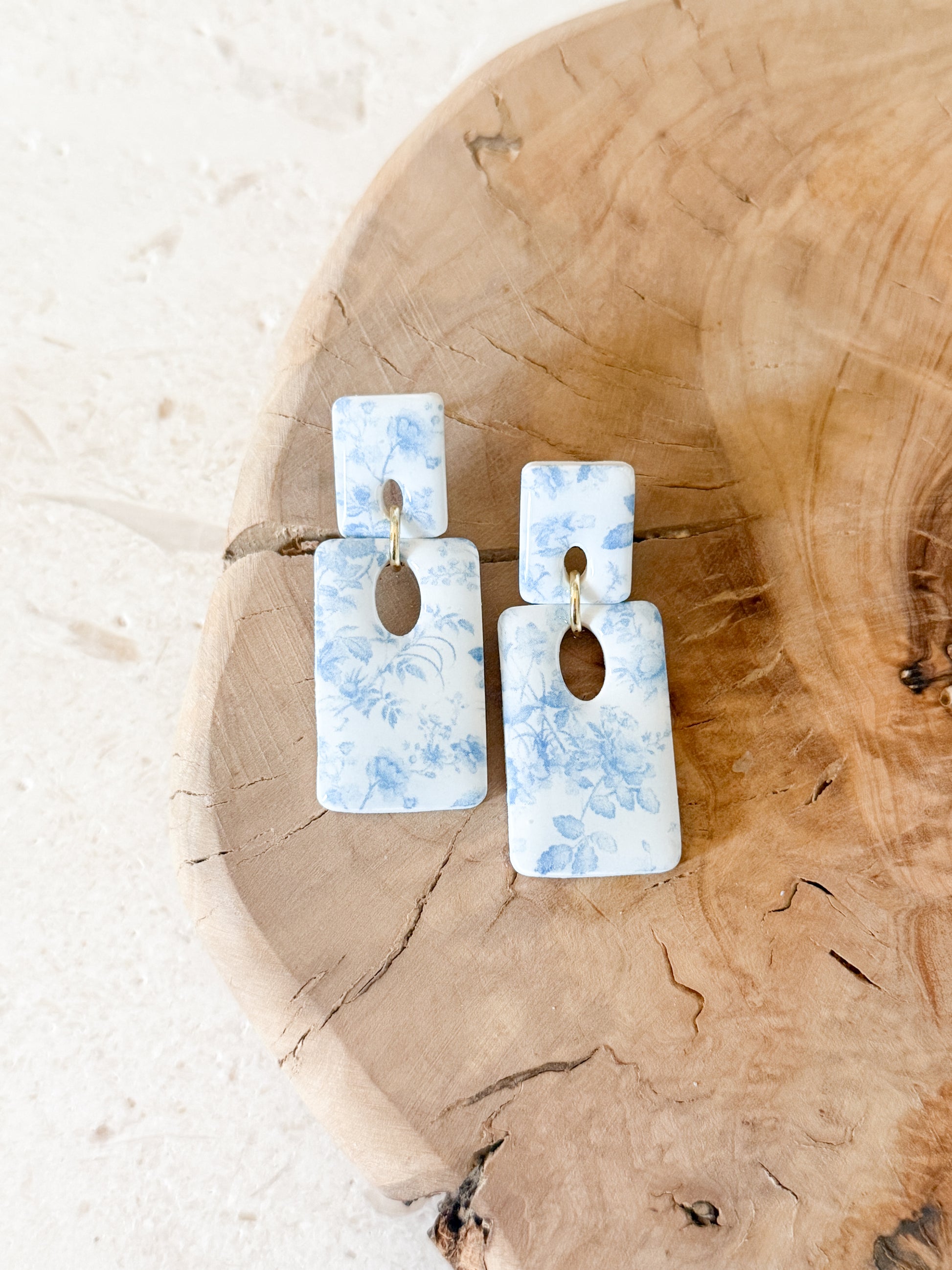Hand-sculpted clay dangles featuring a soft blue pattern and clean rectangular shapes. Lightweight with gentle movement, the Jessa Dangles are finished with gold-plated details for an effortless, everyday statement.