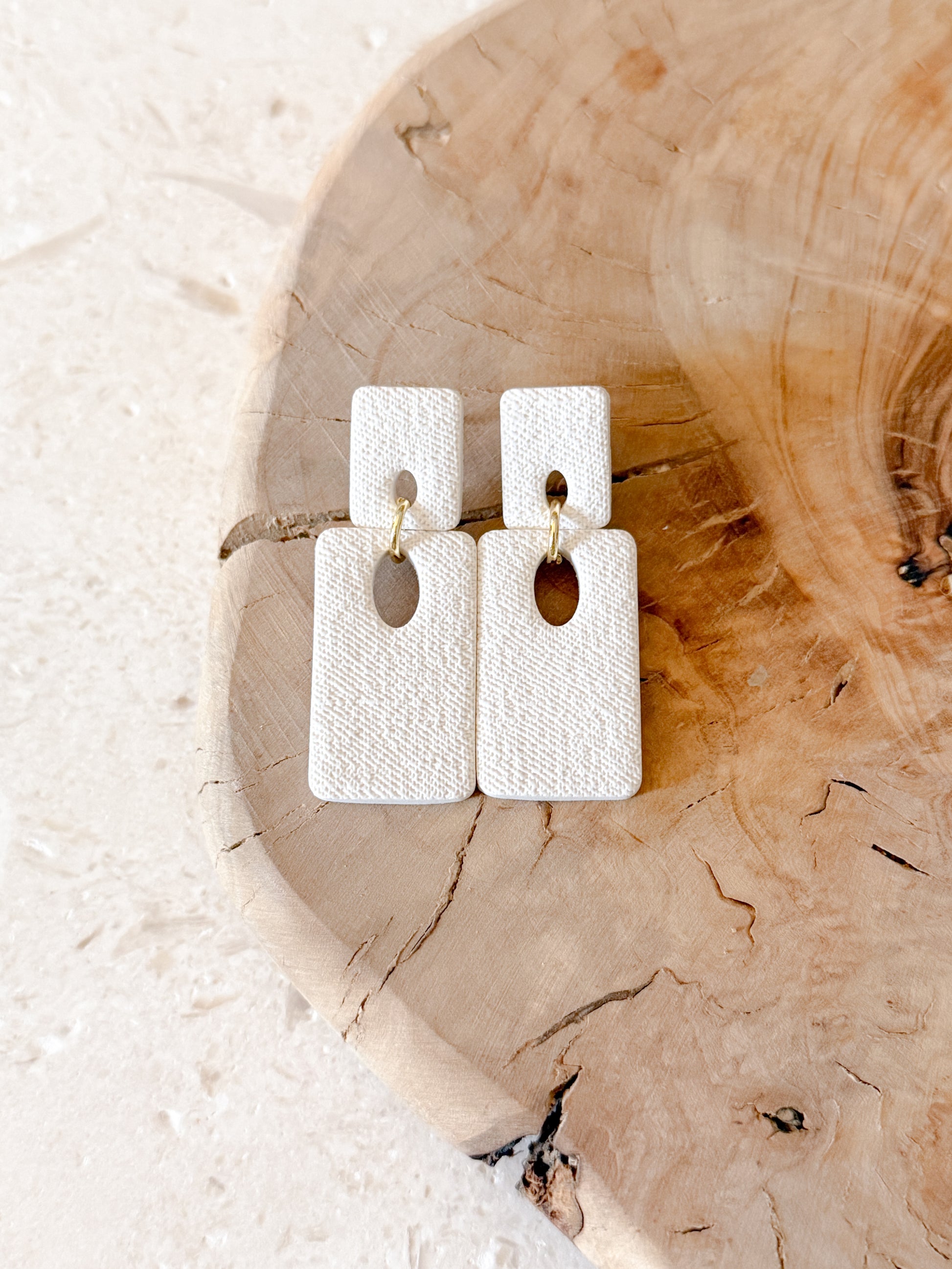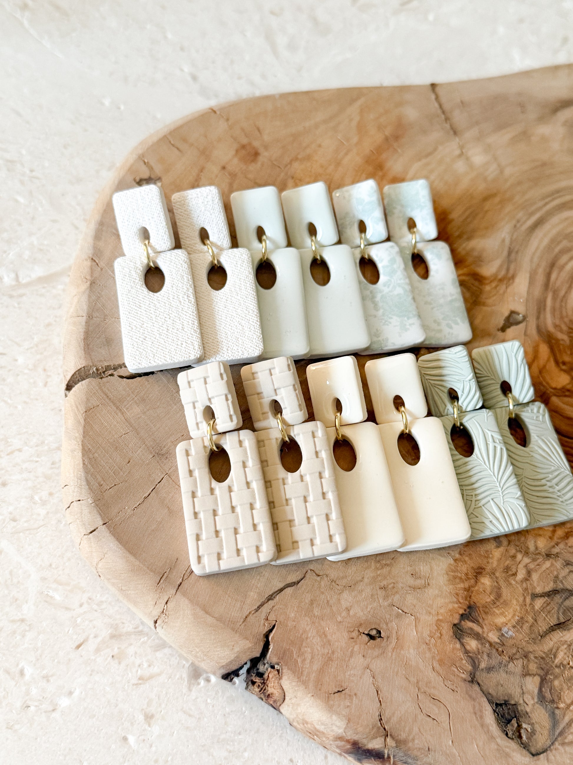 Hand-sculpted clay dangles featuring a soft spring patterns and clean rectangular shapes. Lightweight with gentle movement, the Jessa Dangles are finished with gold-plated details for an effortless, everyday statement.