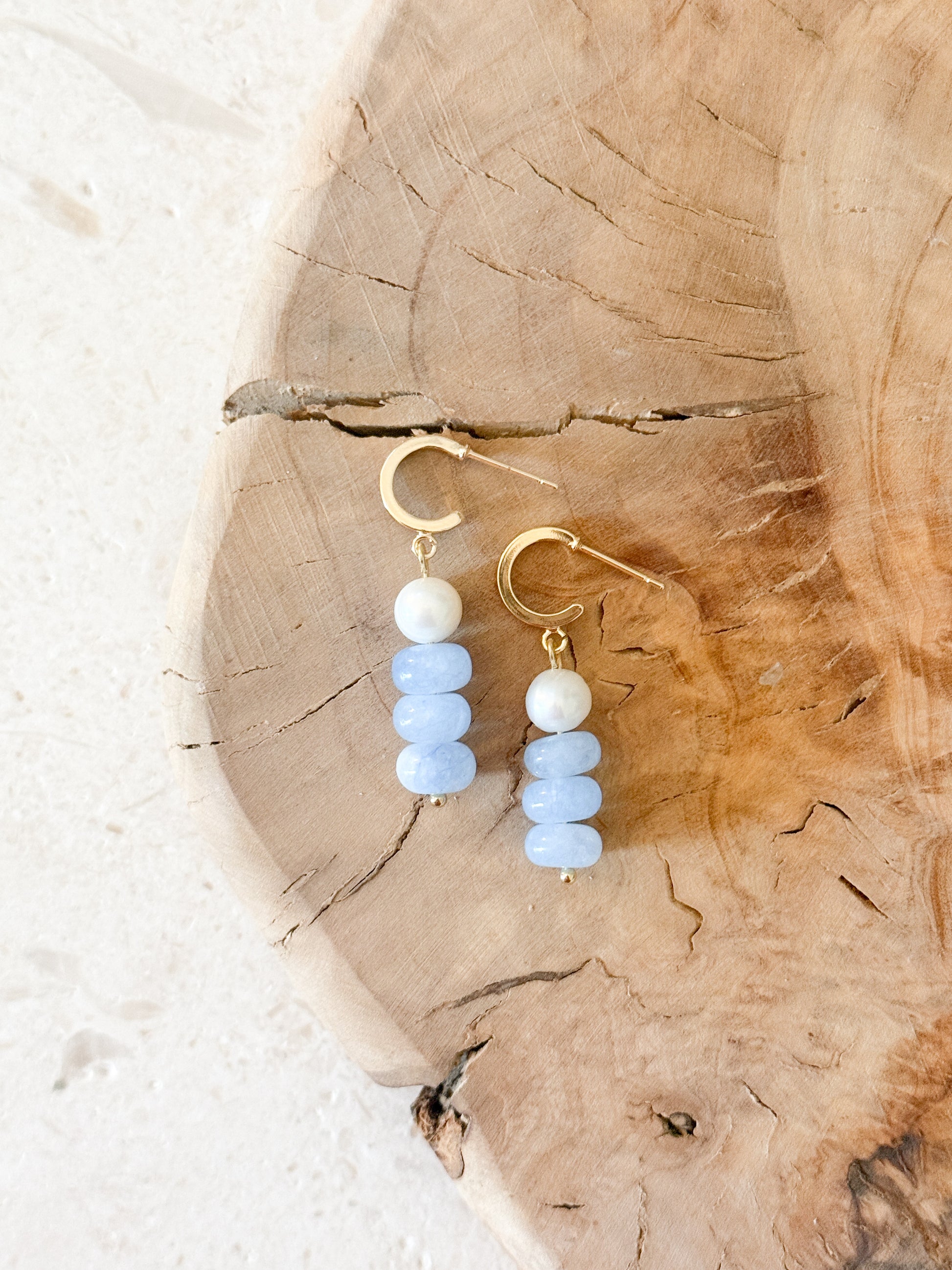 Soft blue gemstones stacked with a luminous freshwater pearl and finished with a gold-plated hoop. Lightweight, elegant, and made to move with you.