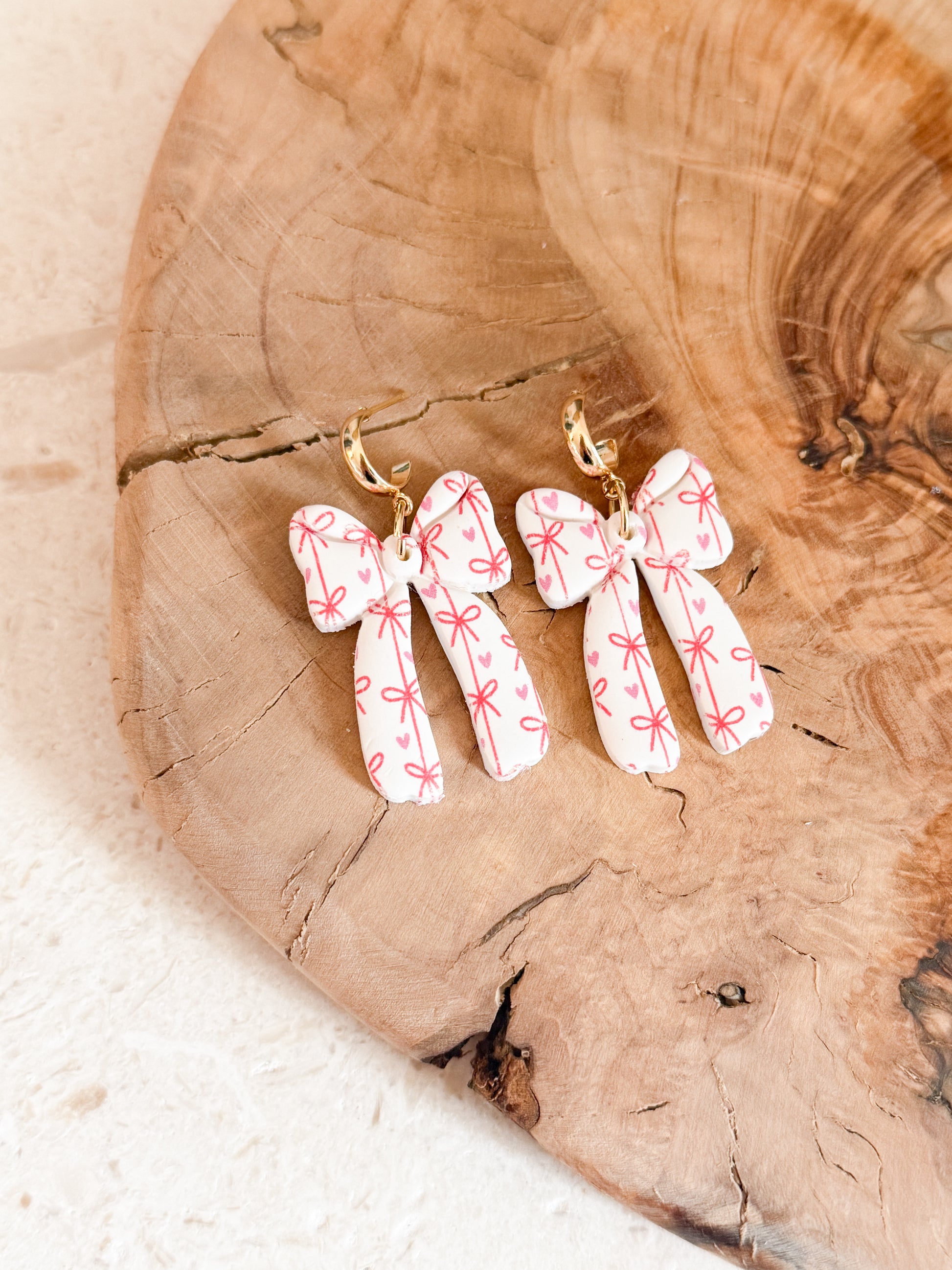 These bow drop earrings are a playful yet elegant statement, handcrafted with soft white clay and detailed with delicate pink bow and heart accents. Finished with gold huggie hoops, this lightweight design adds movement and charm while remaining comfortable for all-day wear.