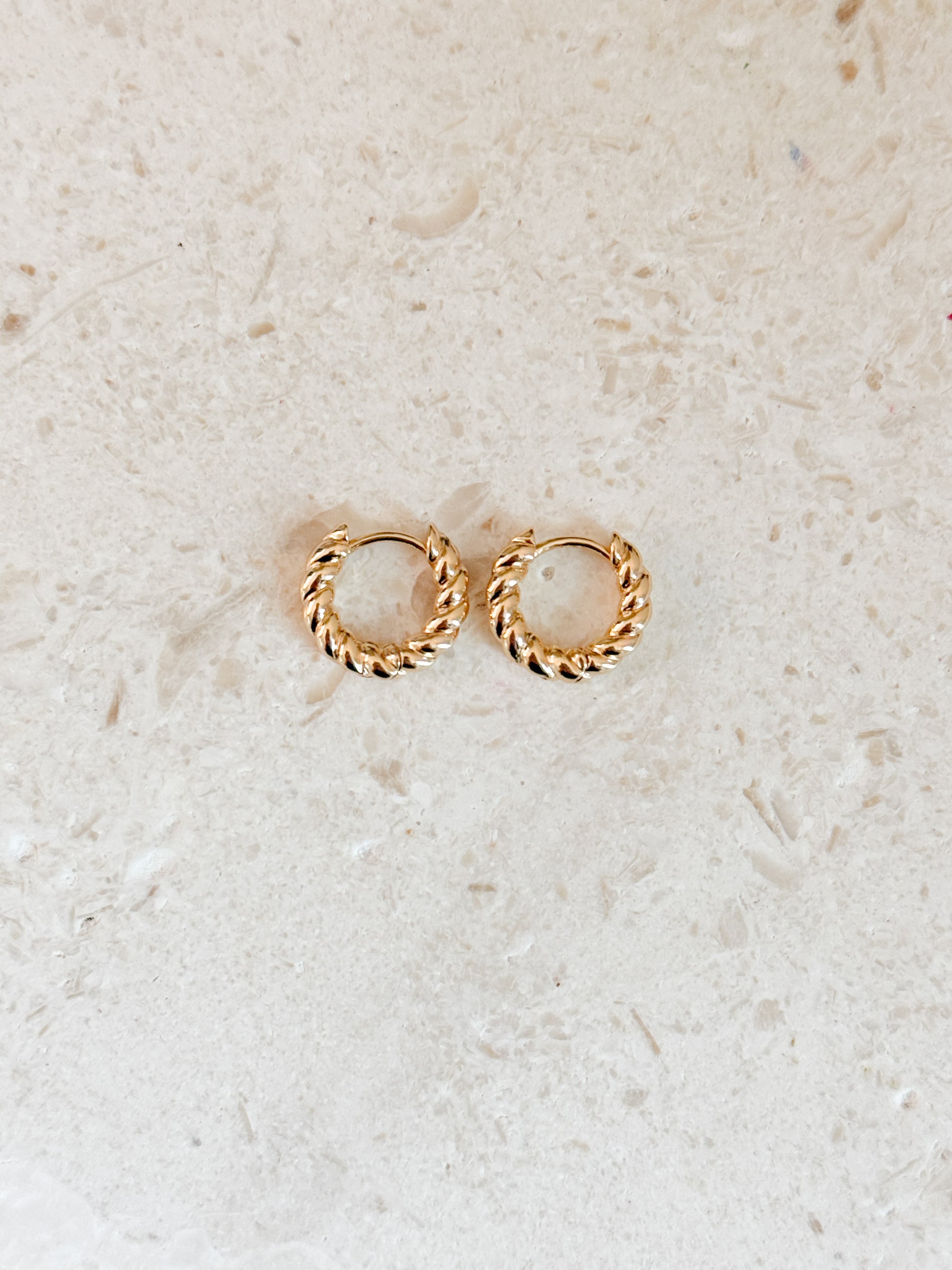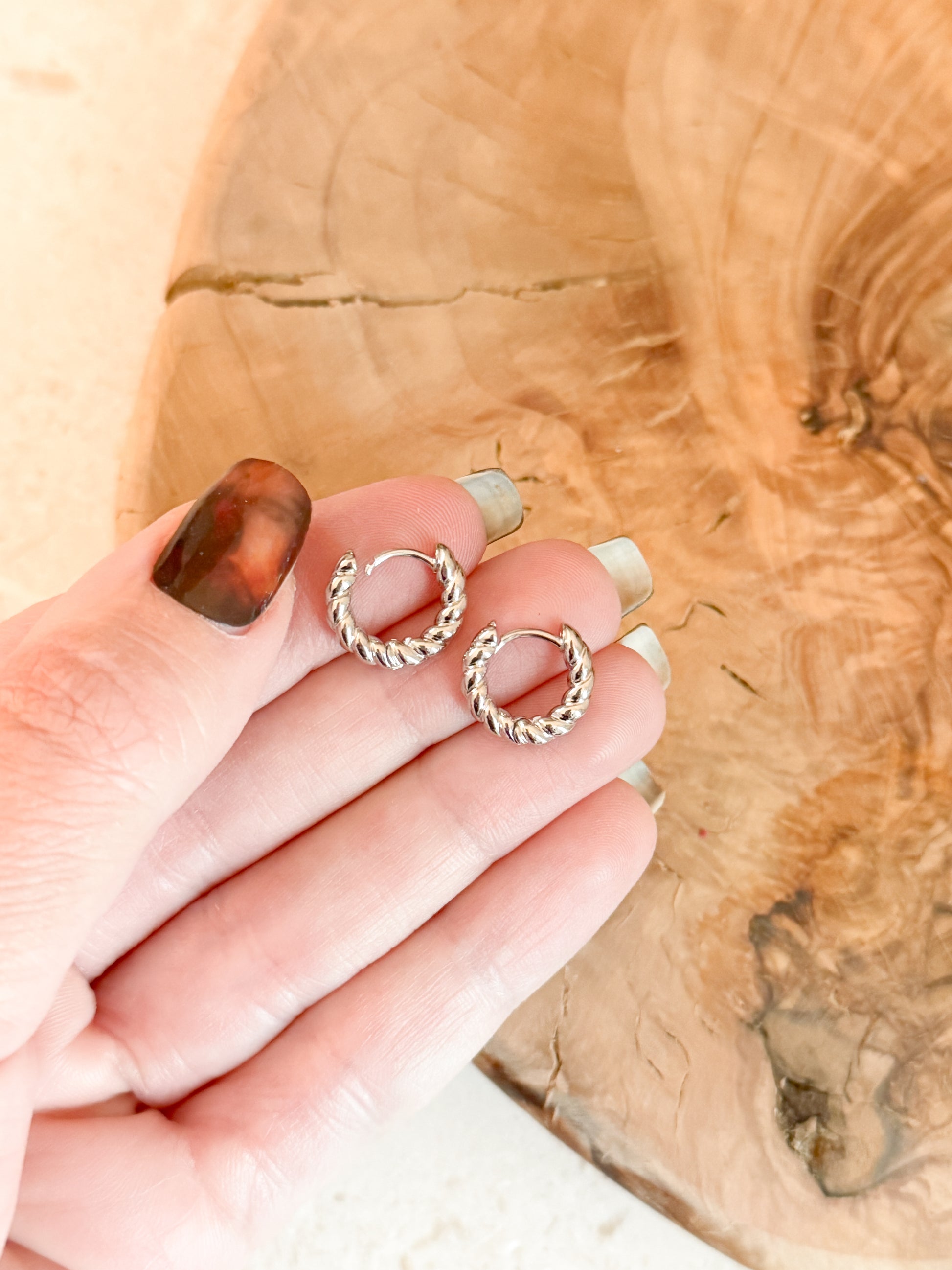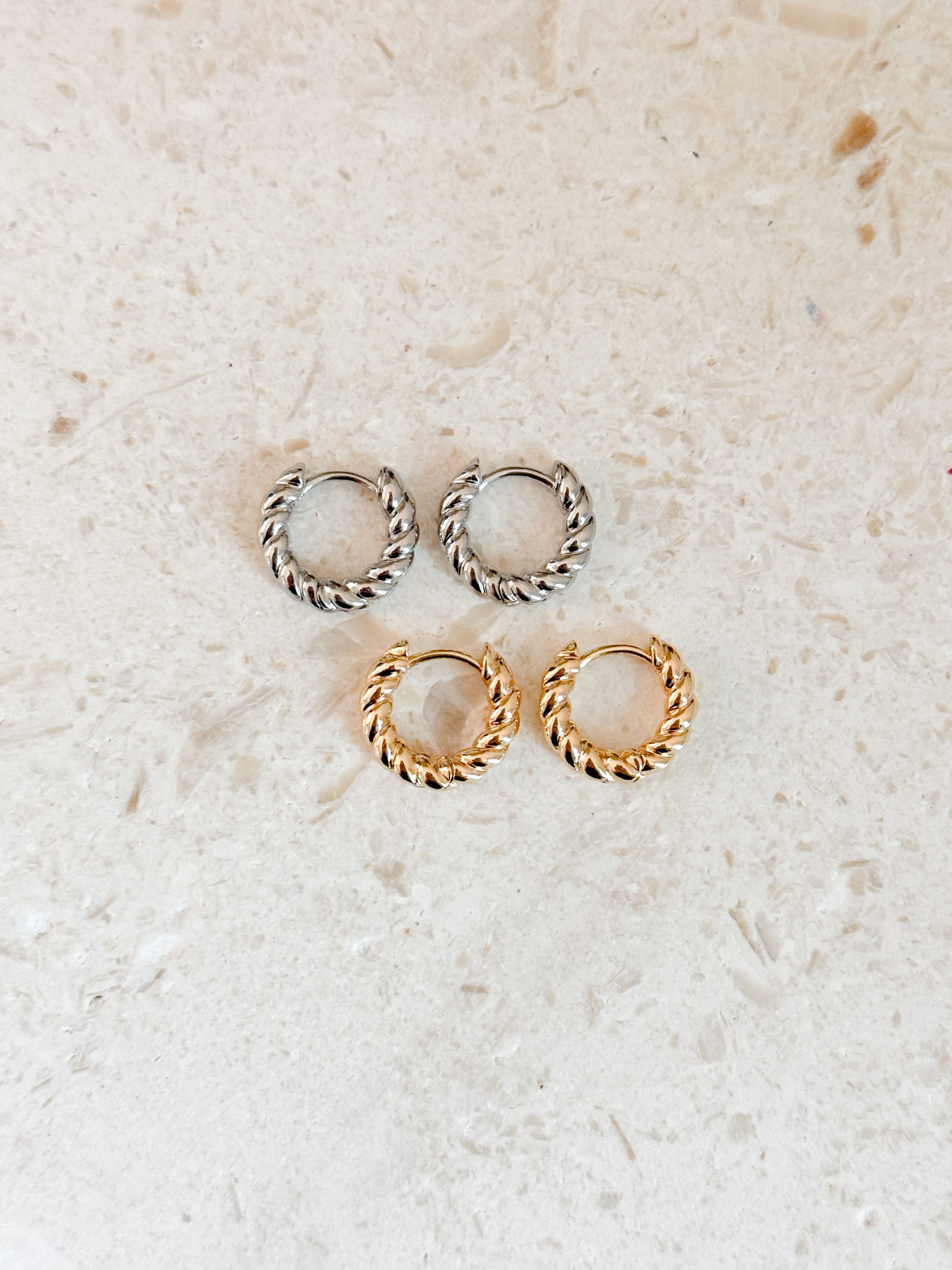 These twisted hoop earrings are a timeless everyday essential with a touch of texture. Featuring a sculpted, rope-inspired design, they add subtle interest while remaining lightweight and comfortable for all-day wear. Available in gold and silver finishes, this versatile style pairs effortlessly with everything from casual basics to elevated looks.